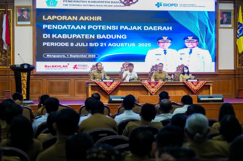 Pemkab. Badung melaksanakan rapat finalisasi laporan akhir pendataan potensi pajak daerah di ruang Kertha Gosana, Puspem Badung, Senin (1/9). Rapat dipimpin langsung Bupati Badung I Wayan Adi Arnawa didampingi Sekda Badung IB Surya Suamba selaku Ketua Tim Terpadu Optimalisasi Pajak Daerah (TOPD) dan diikuti Kadis Penanaman Modal dan Pelayanan Terpadu Satu Pintu (PMPTSP) I Made Agus Aryawan selaku Sekretaris I Tim TOPD, Kepala Bapenda Ni Putu Sukarini selaku Sekretaris II Tim TOPD, dari Kejari Badung sebagai anggota Tim serta Petugas Pendataan dari Perangkat Daerah dan Tim Teknis Sistem Informasi Optimalisasi Pajak Daerah (SIOPD).